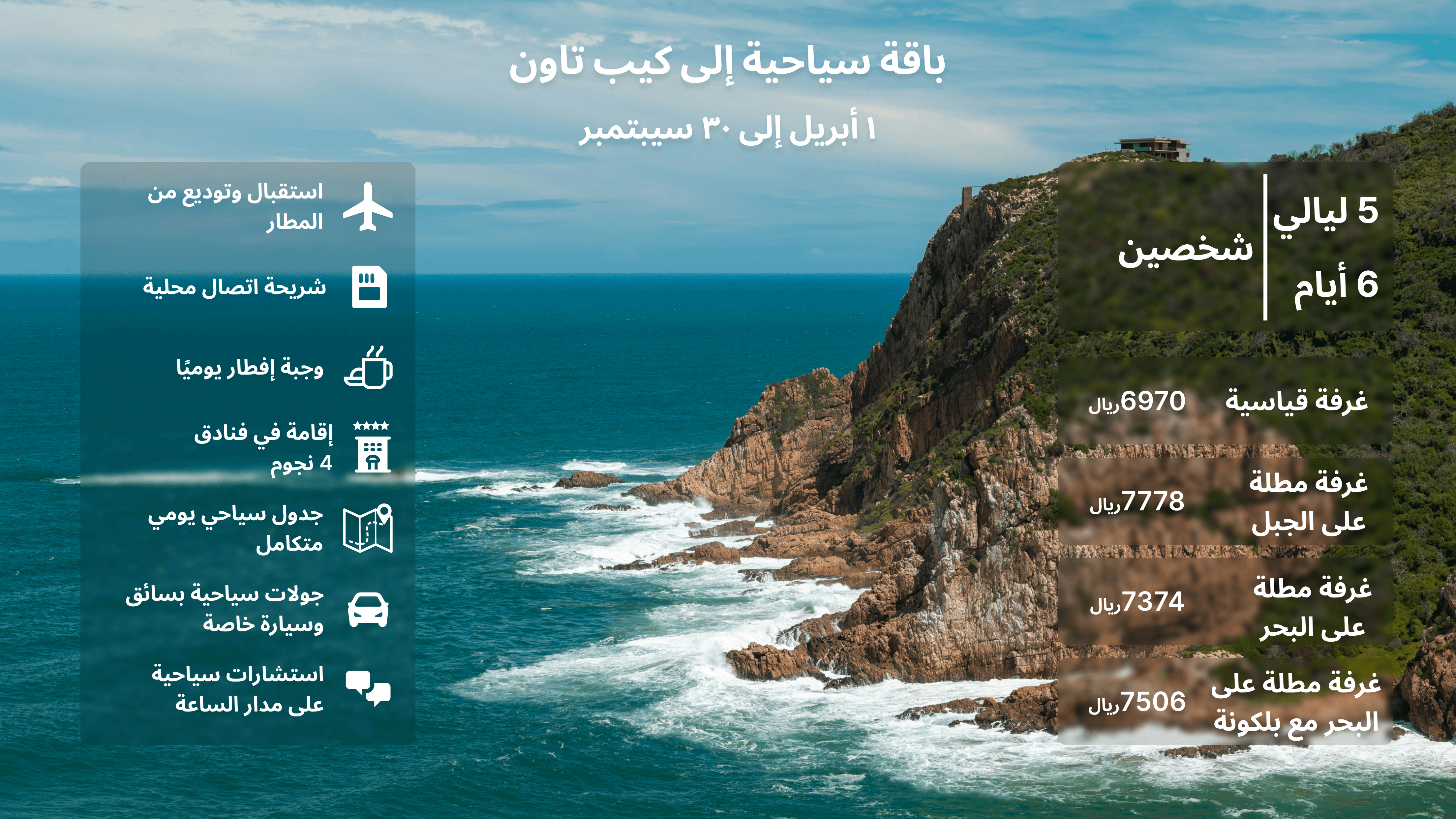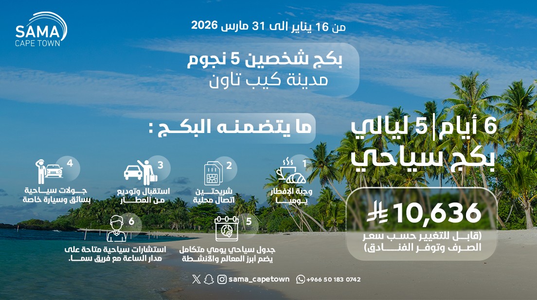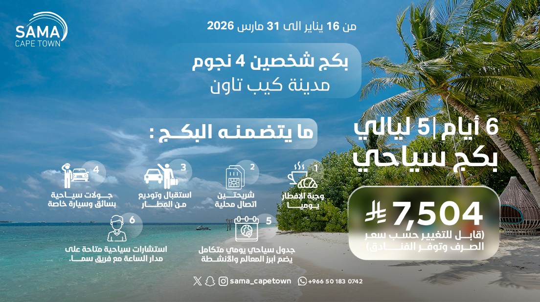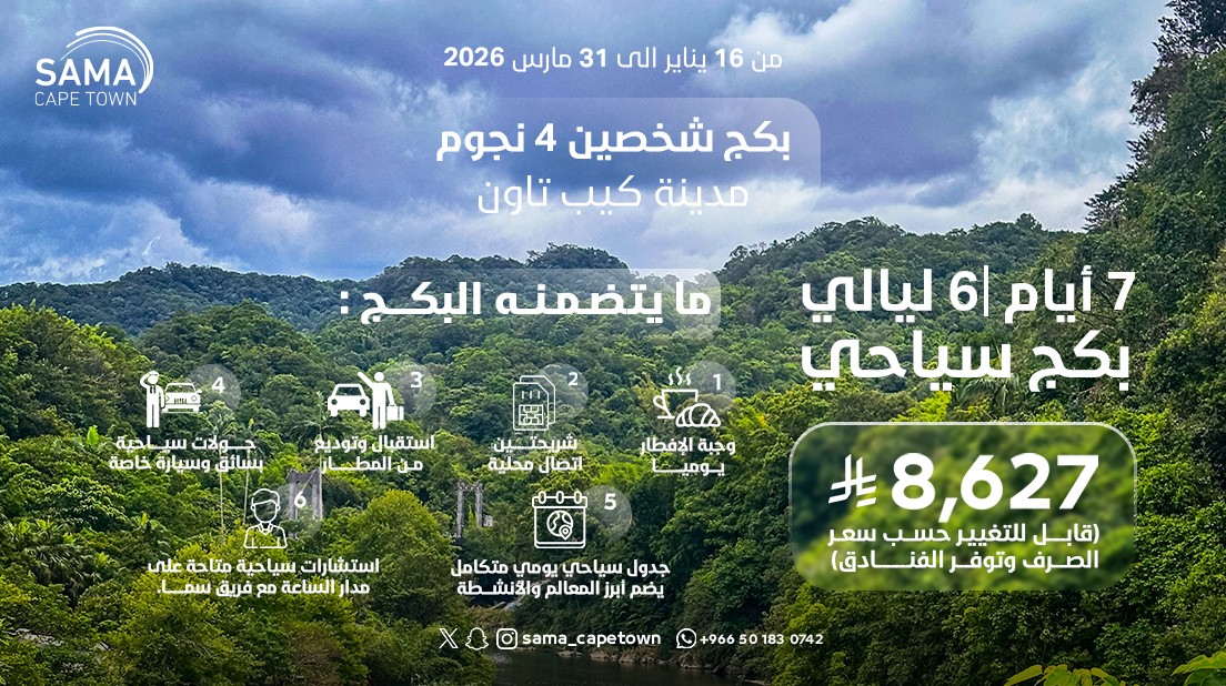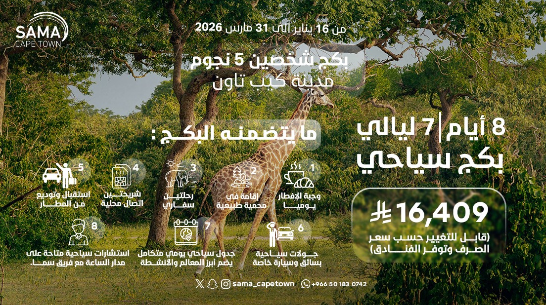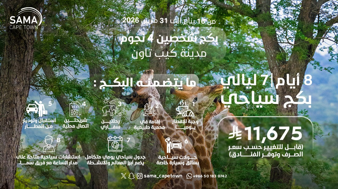 • إقامة فاخرة في فنادق 4 و5 نجوم • إقامة في محمية طبيعية • شريحة إنترنت بسهولة • استقبال وتوديع من المطار • جولات يومية خاصة بسيارة وسائق (10 ساعات يومياً) • جدول سياحي منسق يشمل أبرز المعالم والأنشطة • دعم واستشارات سياحية على مدار الساعة من فريق سما