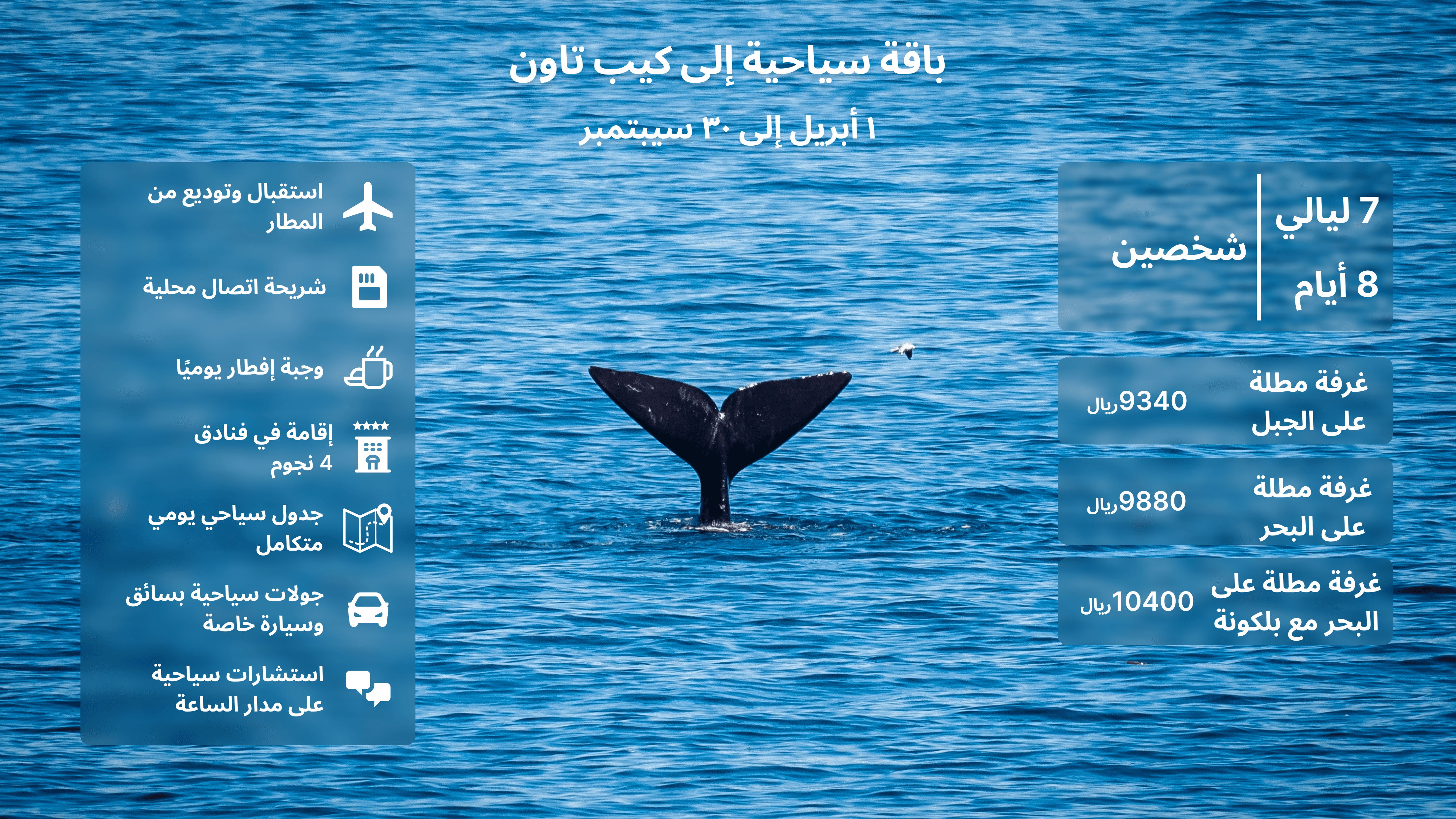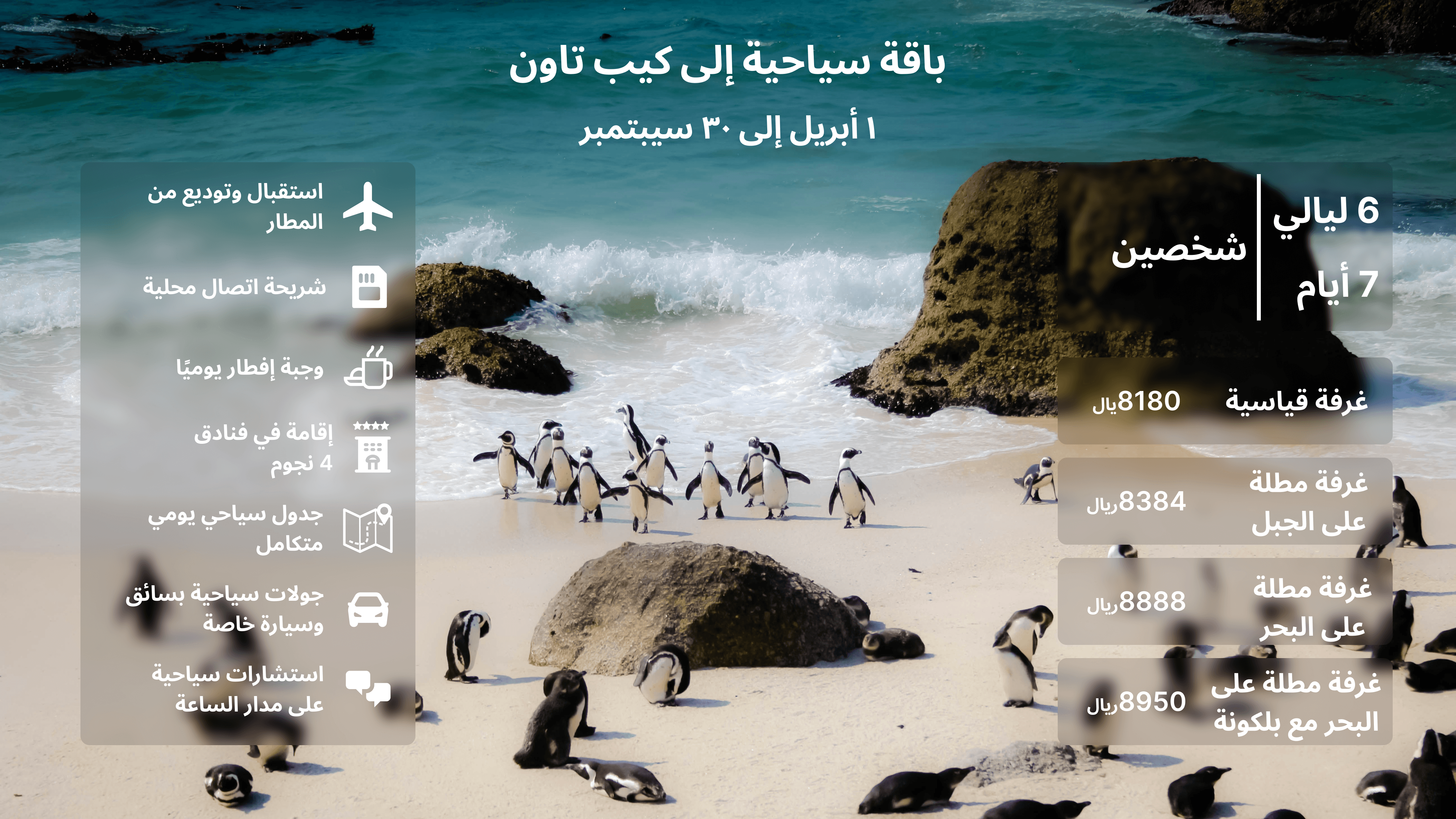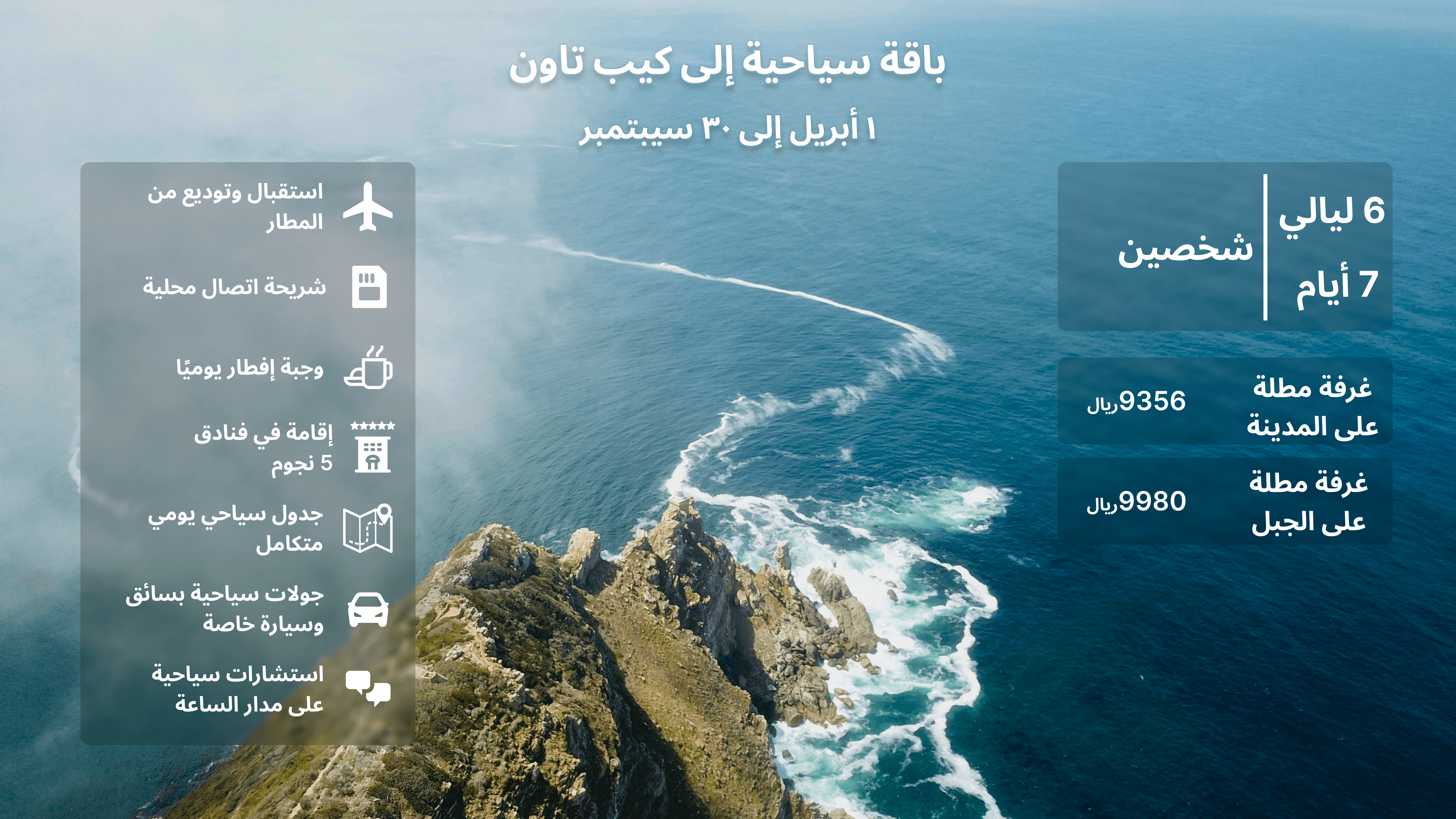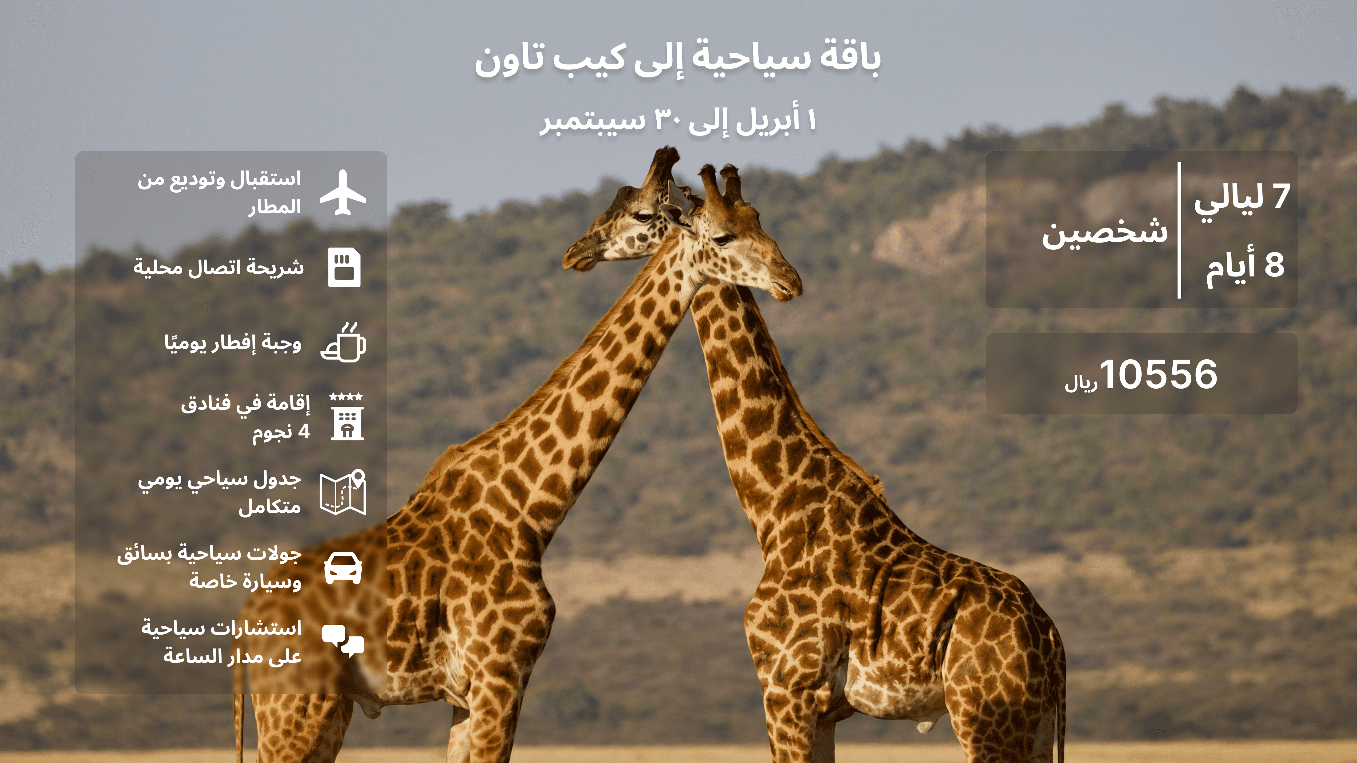 • إقامة فاخرة في فنادق 4 و5 نجوم • إقامة في محمية طبيعية • شريحة إنترنت بسهولة • استقبال وتوديع من المطار • جولات يومية خاصة بسيارة وسائق (10 ساعات يومياً) • جدول سياحي منسق يشمل أبرز المعالم والأنشطة • دعم واستشارات سياحية على مدار الساعة من فريق سما